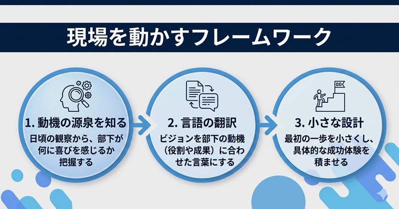 ビジョンを「語る」から、部下が「動きたくなる」働きかけへ。その小さな転換が第一歩になります。