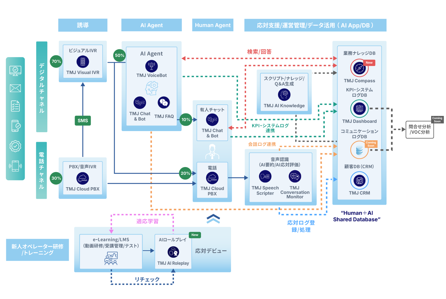 TMJ Generative Solution Platformの提供を通じ、ナレッジ/コミュニケーションログ/KPI・システムログのデータベース基盤を統合するとともに、各種AIアプリケーションを実装・連携。AIが自律的に稼働し、顧客対応からオペレーター支援、管理者の意思決定までを一気通貫で支えます。